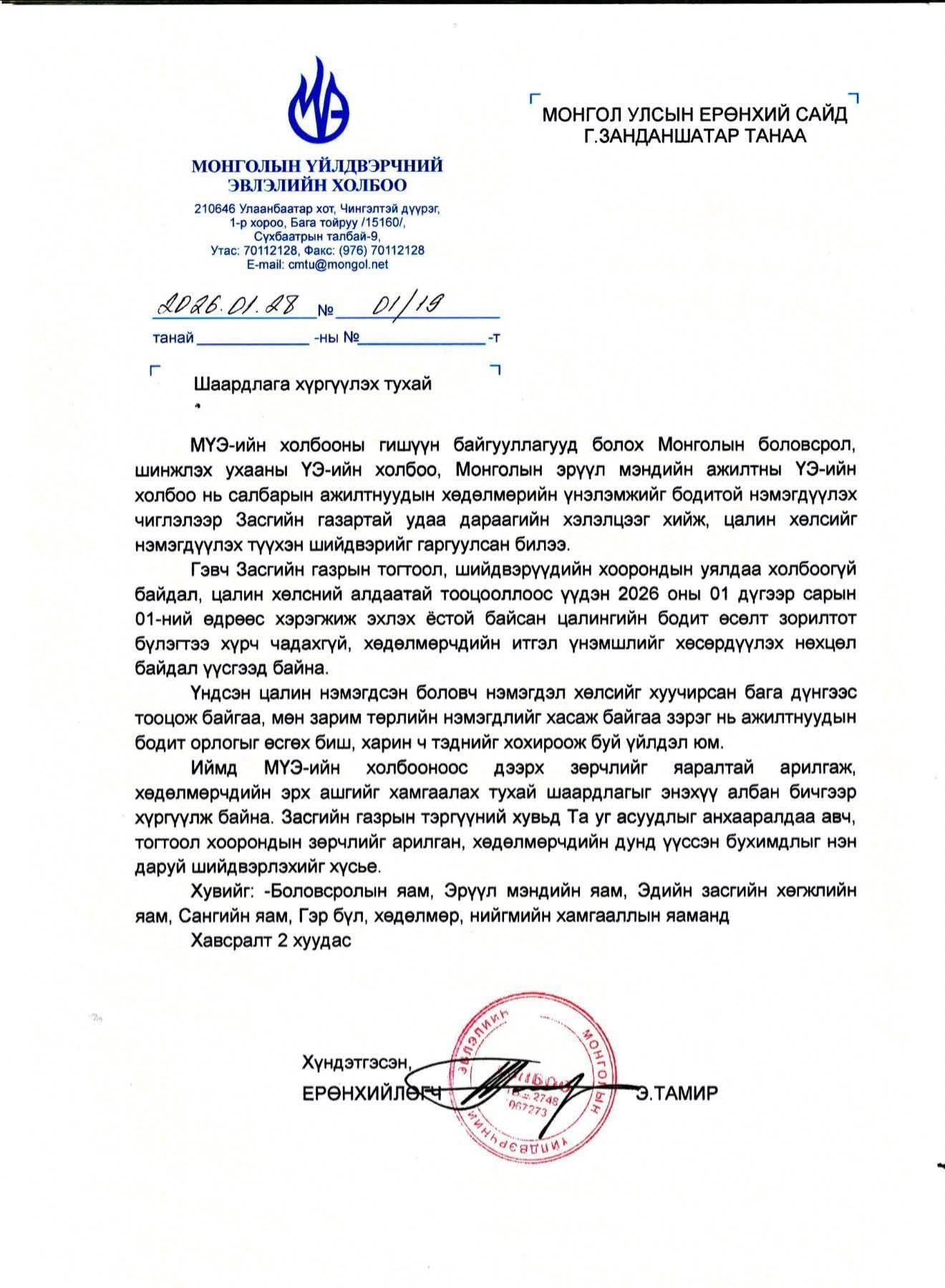 Багш, эмч нарын цалингийн нэмэгдэл, цалин олгох системийг шинэчлэхтэй холбоотой шаардлагыг Ерөнхий сайд Г.Занданшатарт хүргүүлжээ.