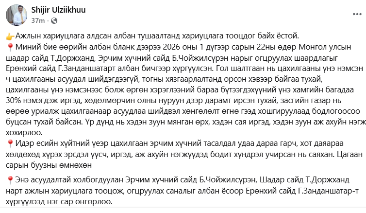 УИХ-ын гишүүн Ө.Шижир Эрчим хүчний сайд Б.Чойжилсүрэн, Шадар сайд Т.Доржханд нарт хариуцлага тооцохыг шаардсан шаардлагыг Ерөнхий сайдад хүргүүлсэн ч энэ талаар ямар нэгэн шийдвэртэй алхам огт хийгдээгүй талаар цахим хуудастаа дурджээ.