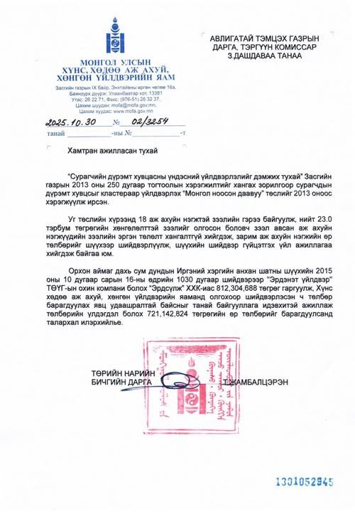 Хүнс, хөдөө аж ахуй, хөнгөн үйлдвэрийн яамны Төрийн нарийн бичгийн дарга Т.Жамбалцэрэнгээс ирүүлсэн албан бичигт “Эрдсүлж” ХХК-иас 812,3 сая төгрөгийг гаргуулах шүүхийн шийдвэр 2015 онд гарсан ч Авлигатай тэмцэх газар идэвхтэй ажилласнаар 721,1 сая төгрөгийн өр төлбөрийг барагдуулсан талаар дурдаж, талархал илэрхийлэв.