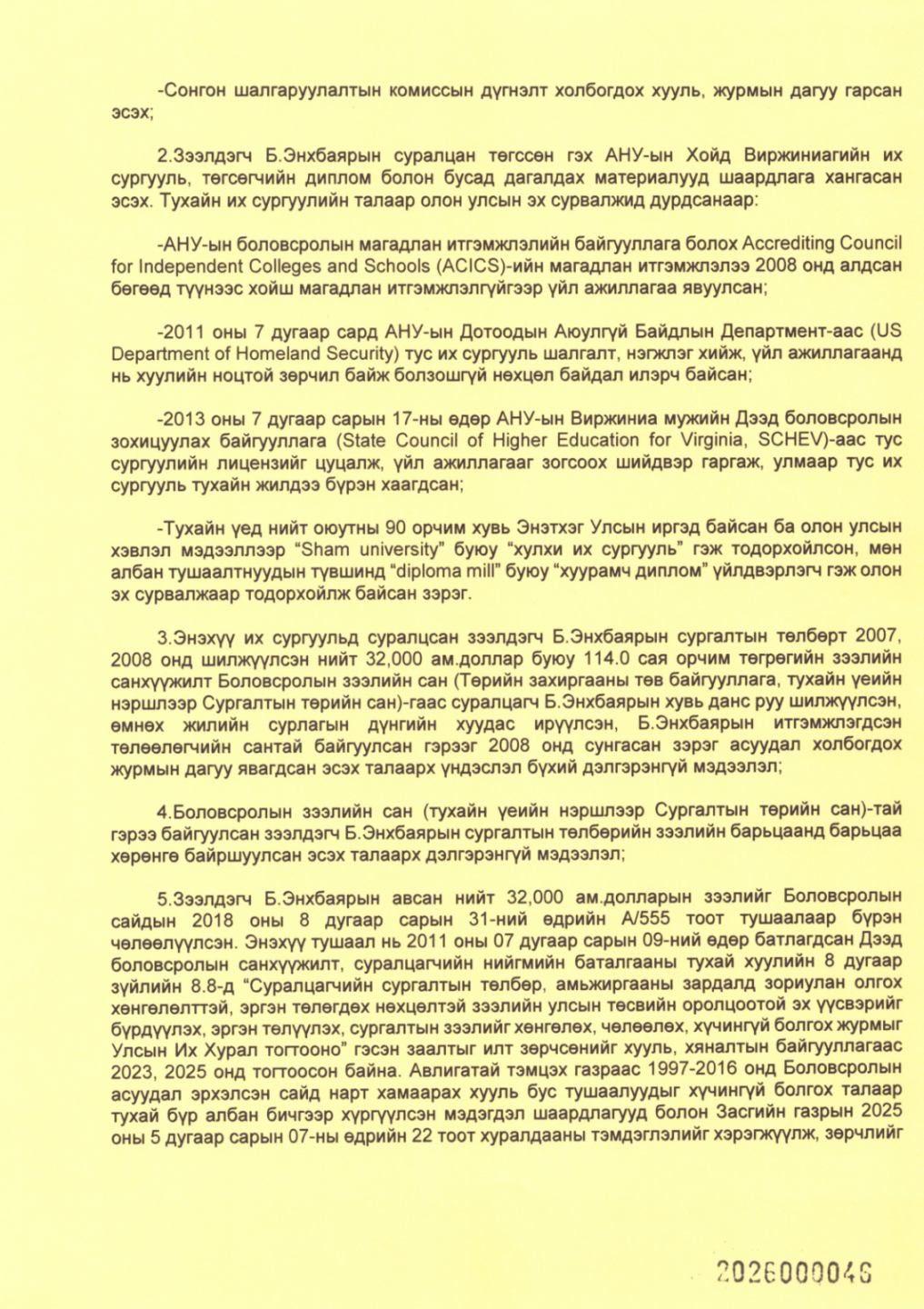 Жич: Хулхи их сургууль “sham university”, хуурамч диплом үйлдвэрлэгч “diploma mill” гэдэг нь ОЛОН УЛСЫН эх сурвалжууд дээр бичигдсэн тодорхойлолтууд болно” гэв.