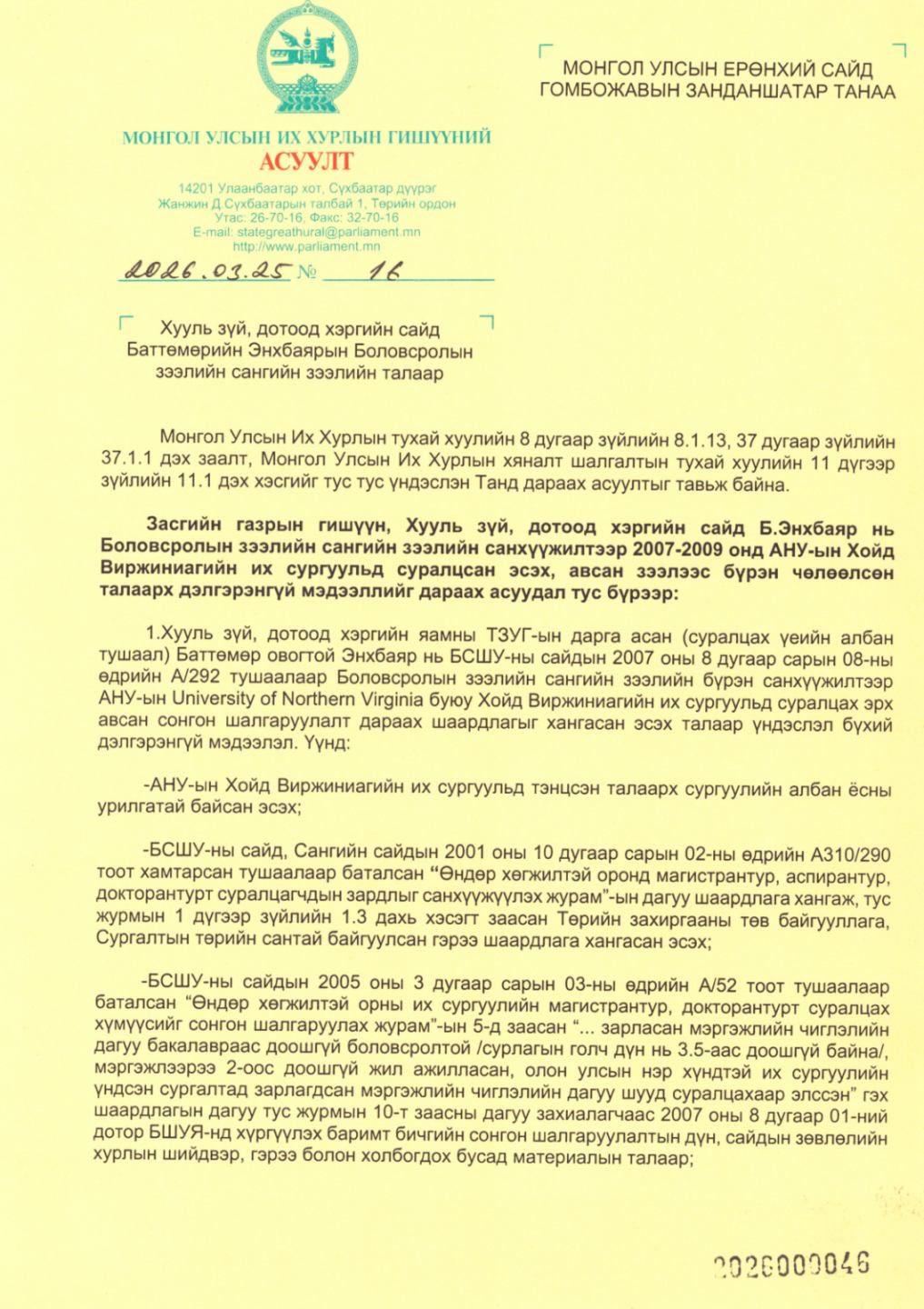Боловсролын зээлийн сангийн зээлийн санхүүжилтээр 2007-2009 онд АНУ-ын Хойд Виржиниагийн их сургуульд суралцсан эсэх, авсан зээлээ бүрэн чөлөөлсөн талаар дэлгэрэнгүй мэдээлэл авахаар ЕРӨНХИЙ САЙДАД асуулт тавилаа.