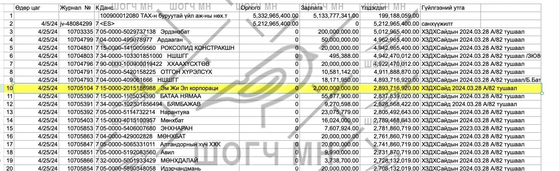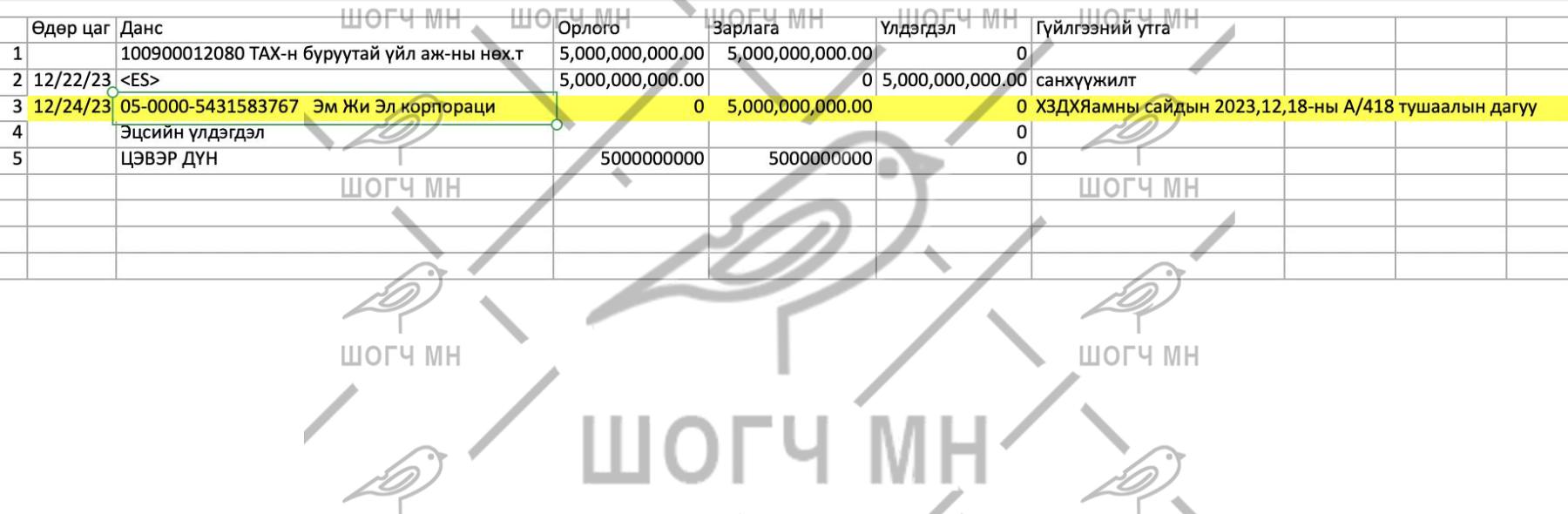 4. Энэ төрлийн ижил гүйлгээ буюу 2,000,000,000₮ ийг мөн "Эм Жи Эл Корпораци" ХХК-руу 2024 оны 04 сарын 25 өдөр шилжсэн байх бөгөөд уг гүйлгээг ХЗДХ сайдын А/82 тоот тушаалыг үндэслэн шилжүүлсэн байна" гэсэн байна.