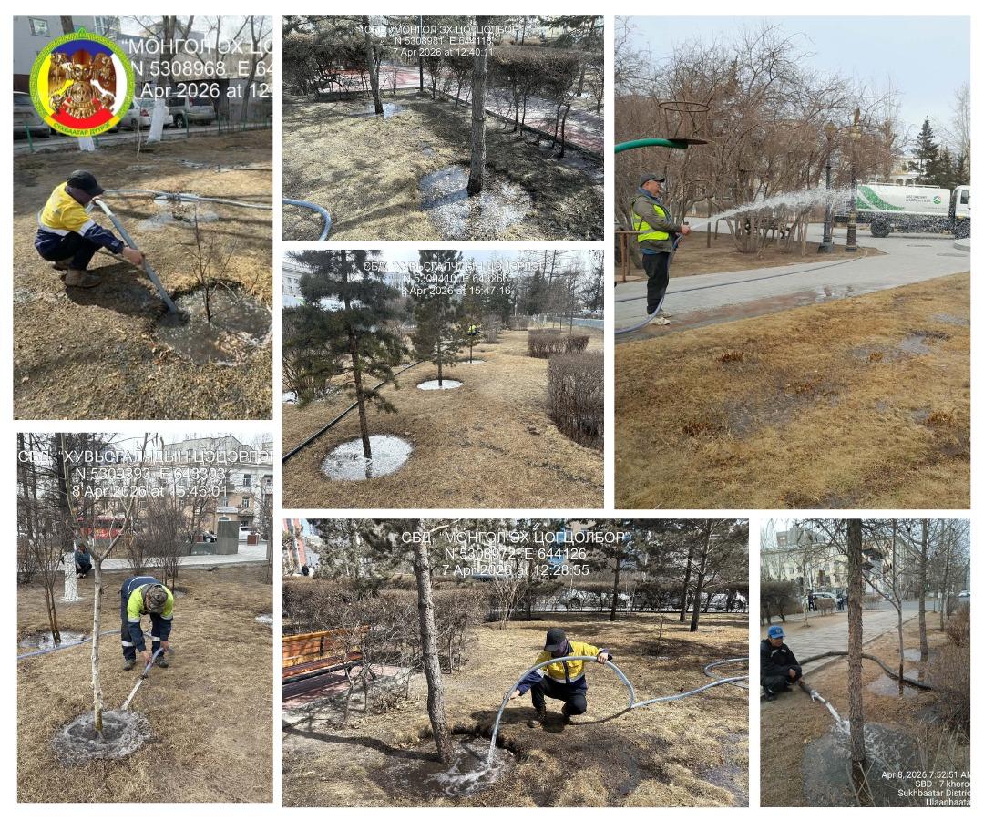 Мөн хаврын цэнэг усалгааны хүрээнд 12 мянга гаруй зүлэгт талбай, 2000 гаруй мод, бут сөөгийг 8 рейс, 48тн усаар услав.